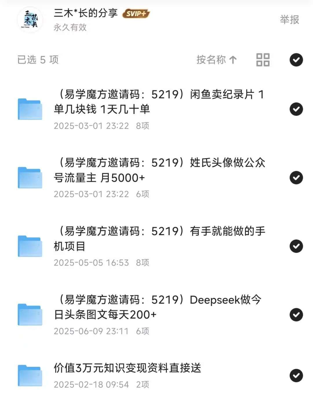 《咸鱼卖纪录片1单几块钱1天几十单》《姓氏头像做公众号流量主月5000+》、《DeepSeek做今日头条图文每天200+》、《有手机就能做的小项目+ 详细版教程(附价值3万元虚拟资源)》。