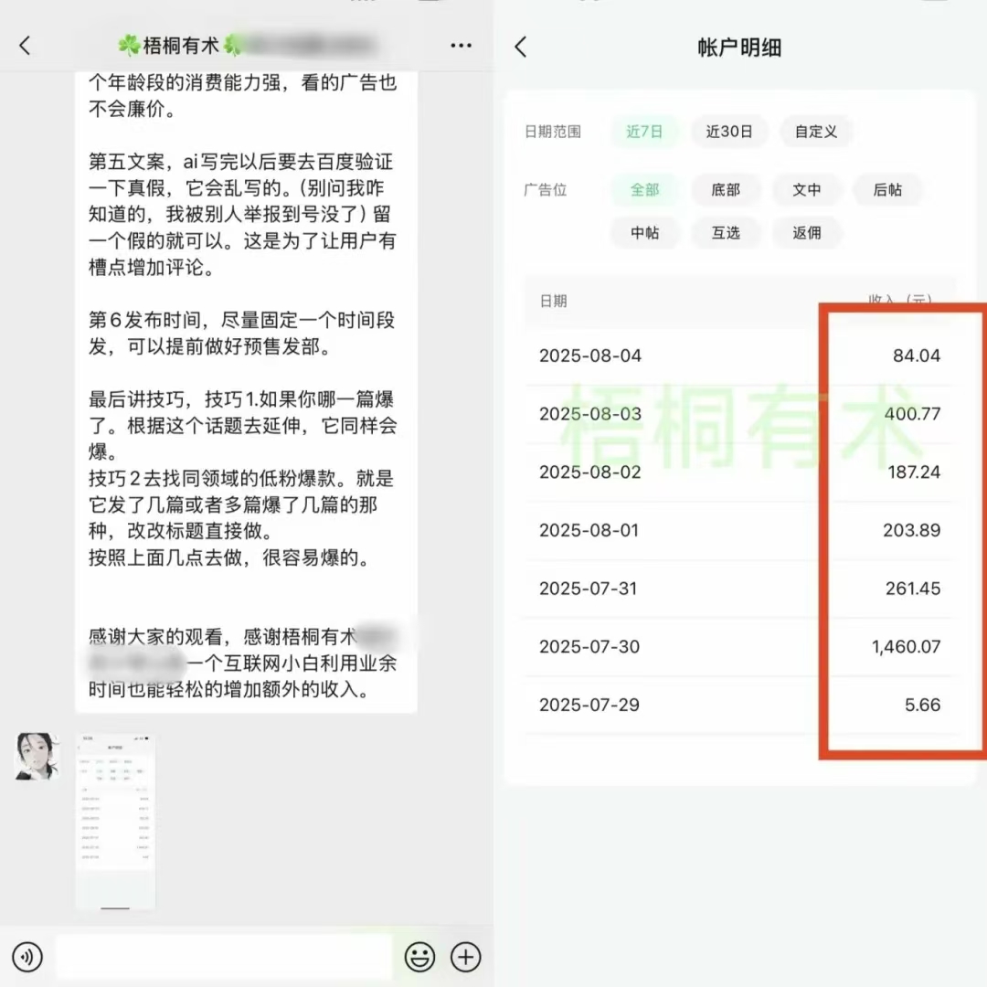 有人惦记的感觉真好,上午我也收到了来自表妹的奶茶。说真的奶茶我并不喜欢,糖分高,喝了饱腹感很强,咖啡因、脂肪含量高,有时候感觉还比较腻,倒是还没一杯柠檬水清爽。刚撕开吸管,插入奶茶杯准备喝,手机来了信息,立马放下手机。一位带孙女的的大姐来哭诉,大概意思她刷手机看别人直播做短剧推广、开网店项目很挣钱,一股脑交了1万学费,结果正如大家所想,打了水漂。最近遇到不少粉丝反映被割韭菜,而且动不动就是几千上万。明明自己什么都不懂不会、还轻信别人挣钱多么简单,结果什么也没学到,意识到被割,已经为时已晚,手机另一面已经露出了诡异的笑脸,你还是上钩了。主要还是认知低,太想挣大钱了。说实话,网上挣钱是比现实相对容易,但也绝不是动动手刷手机钱就自动到账的,镰刀手们也正是抓住了你们这样的心理。挣大钱也都是从挣小钱开始的,没有人能一口吃个胖子,说白了一个项目能不能挣钱还要取决于自身的态度和执行力,看你能不能战胜自己的浮躁和惰性。就像昨天咱们社群的上班族云汐,操作公众号明星手绘方向,开通流量主以后7天收益2600+,熟练以后每天半小时,打开手机就有钱的感觉真让人痛快。特别是这几天收益,每天都是一两百,在7月30日当天直接达到了1460+。所以,即便公众号开放公域这么多年,依然是一个值得深耕的领域和赛道,背靠腾讯这棵大树,不管胃口多大,都能管饱。云汐和很多人一样,是个普通的上班族,在第一次头条失败后,开始总结原因,然后选择了从公众号入手,不断地学习、总结,加上老师的指导,现在也照样拿到了结果。好饭不怕晚,春耕秋收,只要在行动的路上,就不怕没结果。经验分享最后又是往脸上贴金的一段,他说:“感谢梧桐有术给机会,一个互联网小白利用业余时间也能增加收入。"明星手绘赛道其实就是上期咱们分享娱乐赛道的细分领域。想要做这个赛道先思考一个问题,这类图文的爆火,图文重要还是选题重要?首先我们打开豆包,然后给他一个提示词,详情如下图:左侧为提示词,右侧是豆包根据提示词生成的内容,如果不满意,我们可以让AI继续改写。我们可以去网上搜集明星的实拍照片,然后再借用豆包的P图功能,把照片变成我们想要的手绘作品。你可以把作品生成彩铅画、素描画、漫画、什么风格都可以,只有你想不到,没有它做不到的。打开豆包上传原图,然后再给AI提示词:帮我把上方图片风格转变为写实素描风格,精细刻画人物轮廓、服饰纹理。然后直接保存图片,如果效果不满意,继续丰富提示词即可。这个时候需要用到做图软件,制作图片的方式也有很多种,哪种顺手就用哪个,比如我们以手机版美图秀秀为例。然后保存配方模板,下次直接上传图片,修改文字即可。同样的方法去做下张图就可以,其实整个操作流程很简单,先借助AI生成文案,然后找素材,借助AI生成图片,最后就是制作图片。有些人会问:我为什么我总是推荐公众号、头条、私域之类的项目,因为这些项目是长久、稳定、沉淀式正规项目,而不是各种撸红包、吃了上顿没下顿的短期项目。大家都知道公众号开通流量主需要500粉丝,很多人就是耐不住性子,发个几天作品没阅读,立马直接放弃了,如果以这样的态度,做互联网你还做个锤子。还有那些做项目心态极其浮躁的人,如果像逆天改命就踏实点,一步步来吧。好了,今天的分享就到这里,如果你是刚入互联网的小白,想打造第二份收入,每个月多挣几千上万,也欢迎来我社群沉淀一下,详情查看下方蓝色链接: